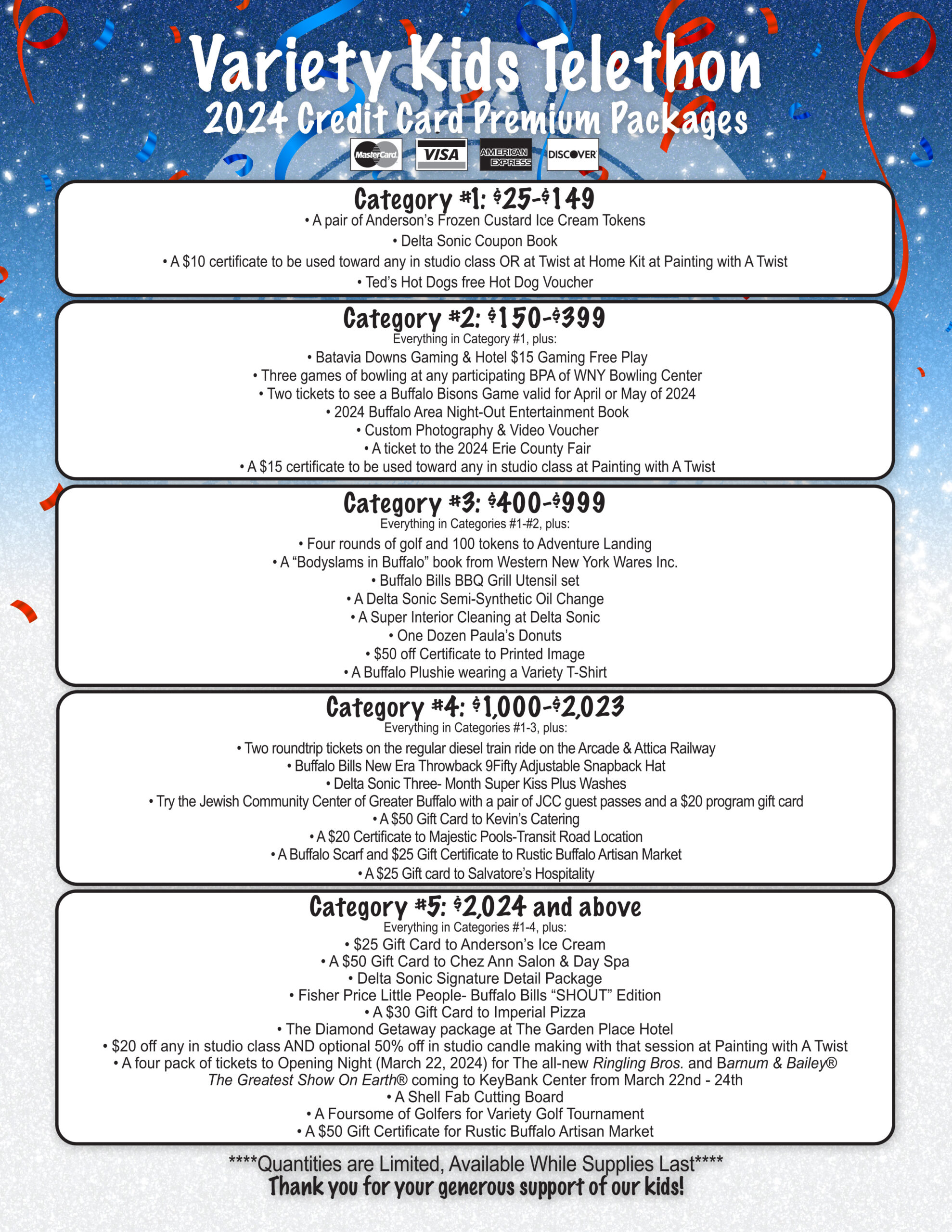 Category #5: $2,024+ Everything in Categories #1-4, plus:  | -$25 Gift Card to Anderson’s Ice Cream -A $50 Gift Card to Chez Ann Salon & Day Spa -Delta Sonic Signature Detail Package -Fisher Price Little People- Buffalo Bills “SHOUT” Edition -A $30 Gift Card to Imperial Pizza -The Diamond Getaway package at The Garden Place Hotel -$20 off any in studio class AND optional 50% off in studio candle making with that session at Painting with A Twist -A four pack of tickets to Opening Night (March 22, 2024) for The all-new Ringling Bros. and Barnum & Bailey® The Greatest Show On Earth® coming to KeyBank Center from March 22nd – 24th -A Shell Fab Cutting Board -A Foursome of Golfers for Variety Golf Tournament -A $50 Gift Certificate for Rustic Buffalo Artisan Market