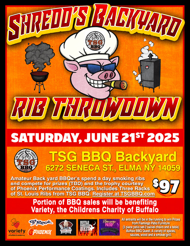 Come join us for  “Shredd’s Backyard Rib Throwdown” on Saturday, June 21st at TSG BBQ (backyard) located at 6272 Seneca Street, Elma, NY 14059.
